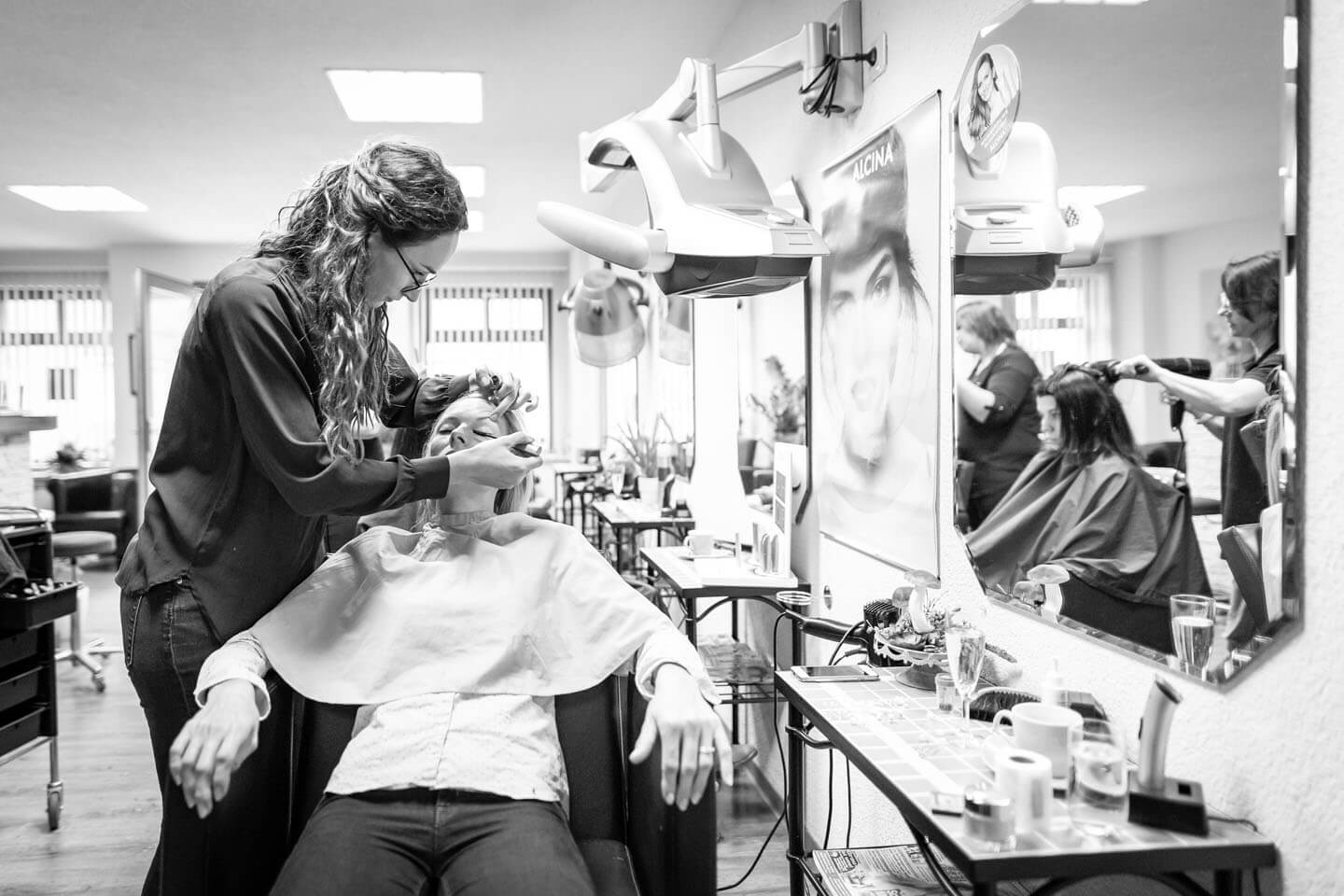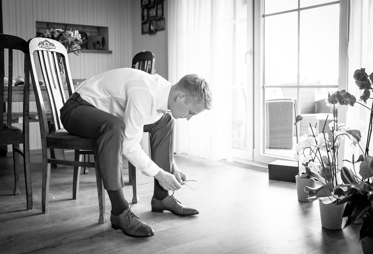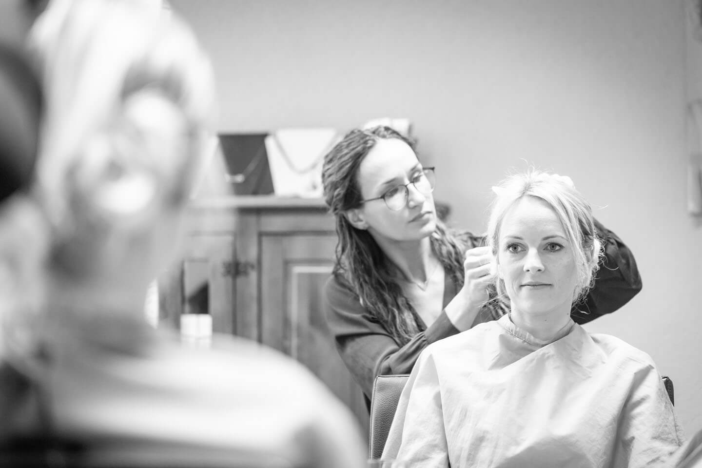 Eines meiner Lieblingsfotos vom „Getting Ready“ aus 2018. Links wird Braut Katrin geschminkt, rechts blickt Gleich-Gatte René aus dem Fenster.