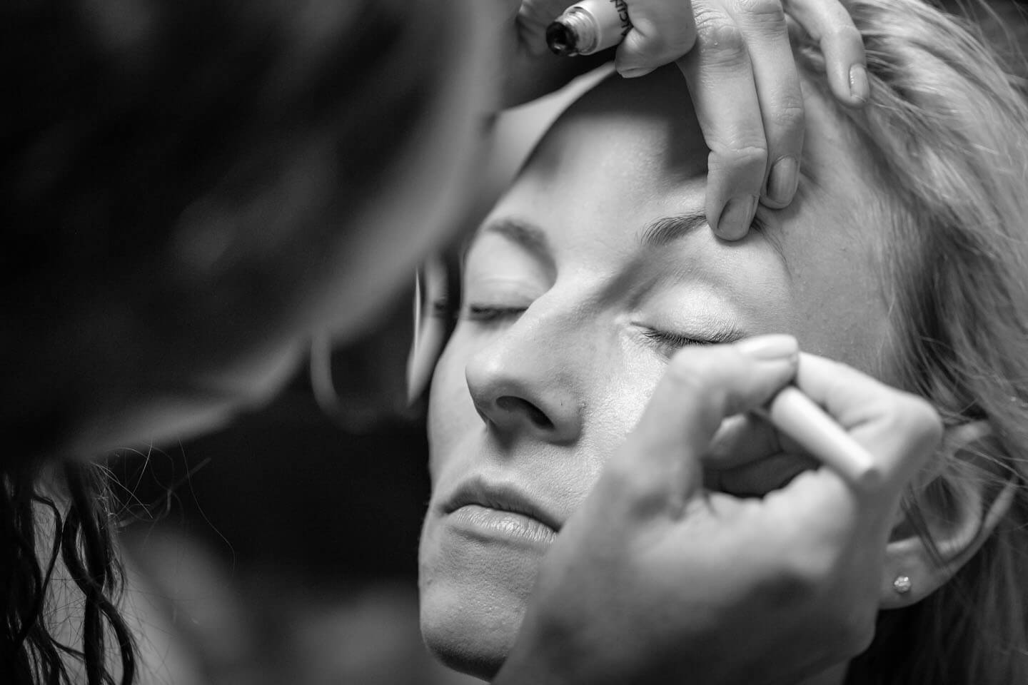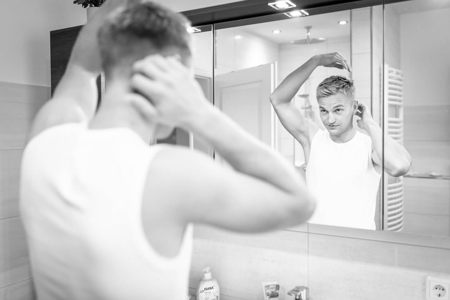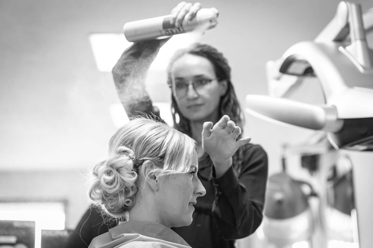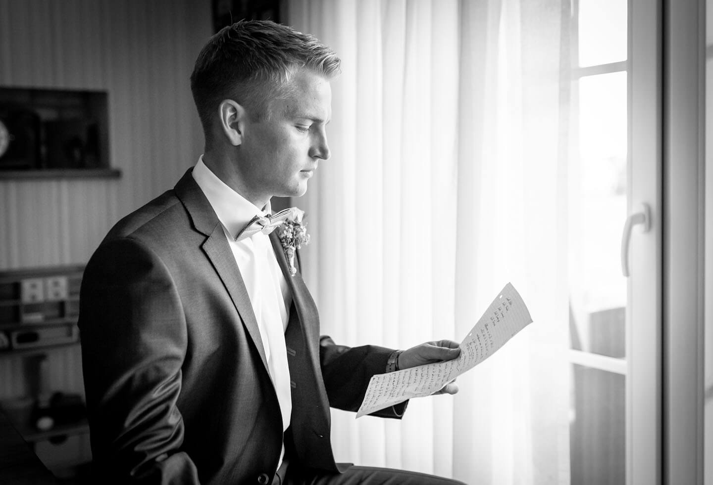 Eines meiner Lieblingsfotos vom „Getting Ready“ aus 2018. Links wird Braut Katrin geschminkt, rechts blickt Gleich-Gatte René aus dem Fenster.