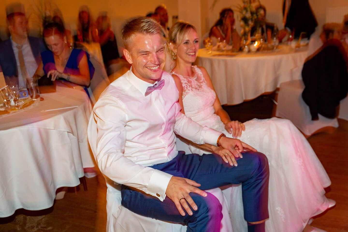 Noch etwas zum Schmunzeln: Auf jeder Hochzeit nimmt man sich irgendwann ein gutes Stündchen Zeit für die klassischen Hochzeitsfotos. Ich suche mir dann mit dem Hochzeitspaar und einem Helfer einige schöne Ecken zum Fotografieren. Hier und da gebe ich Anweisung für einen besseren Stand und das Posing. Und weil man ja nicht immer weiß wohin mit den Armen wenn man fotografiert wird, sage ich oft zum Bräutigam: „Deine Hand hängt ein bisschen ungenutzt herunter. Fass damit mal bitte deine Frau an.“ Jetzt kommt’s: In 50% dieser Situationen geht die Hand spaßeshalber (aber intuitiv) an: die Brust der Frau! Ich habe Dutzende solcher Fotos – zeigen werde ich sie hier natürlich nicht.